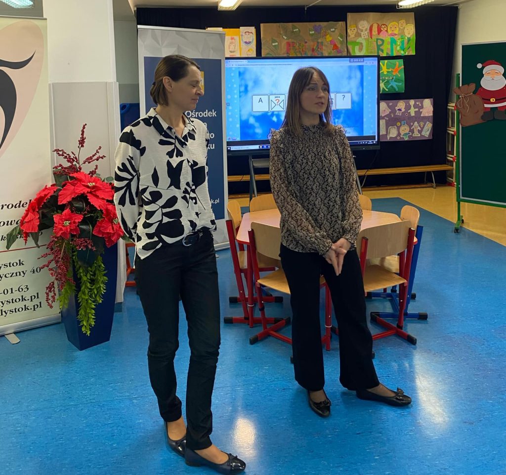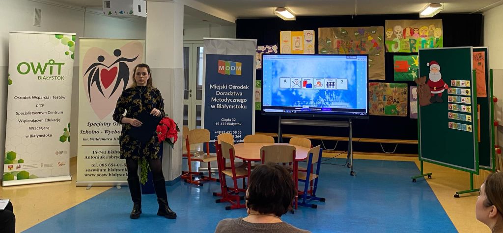 Dyrektor Specjalnego Ośrodka Szkolno-Wychowawczego im. Waldemara Kikolskiego w Białymstoku – Ewa Łupińska przywitała gości i otworzyła konferencję. Nasze specjalistki od AAC – Anna Minkiewicz i Marzanna Karpowicz po raz kolejny zaprezentowały inspirujące zajęcia z uczniami, dzieląc się swoją wiedzą, doświadczeniem i dobrymi praktykami. Kinga Natusiewicz – wicedyrektor SOSW przedstawiła informacje nt. funkcjonowania Ośrodka Wsparcia i Testów i możliwościach wspierania osób z niepełnosprawnościami i ich rodzin. Andrzej Cwaliński merytorycznie omówił podstawy prawne i praktyczne możliwości wykorzystania AAC w codziennej pracy z uczniami.